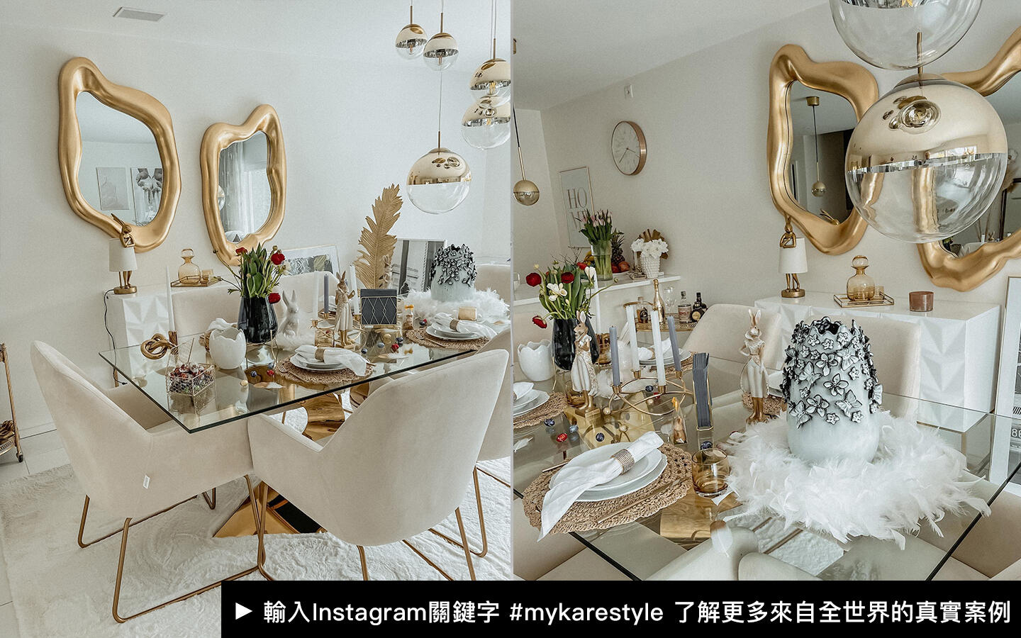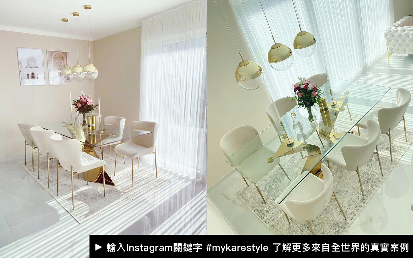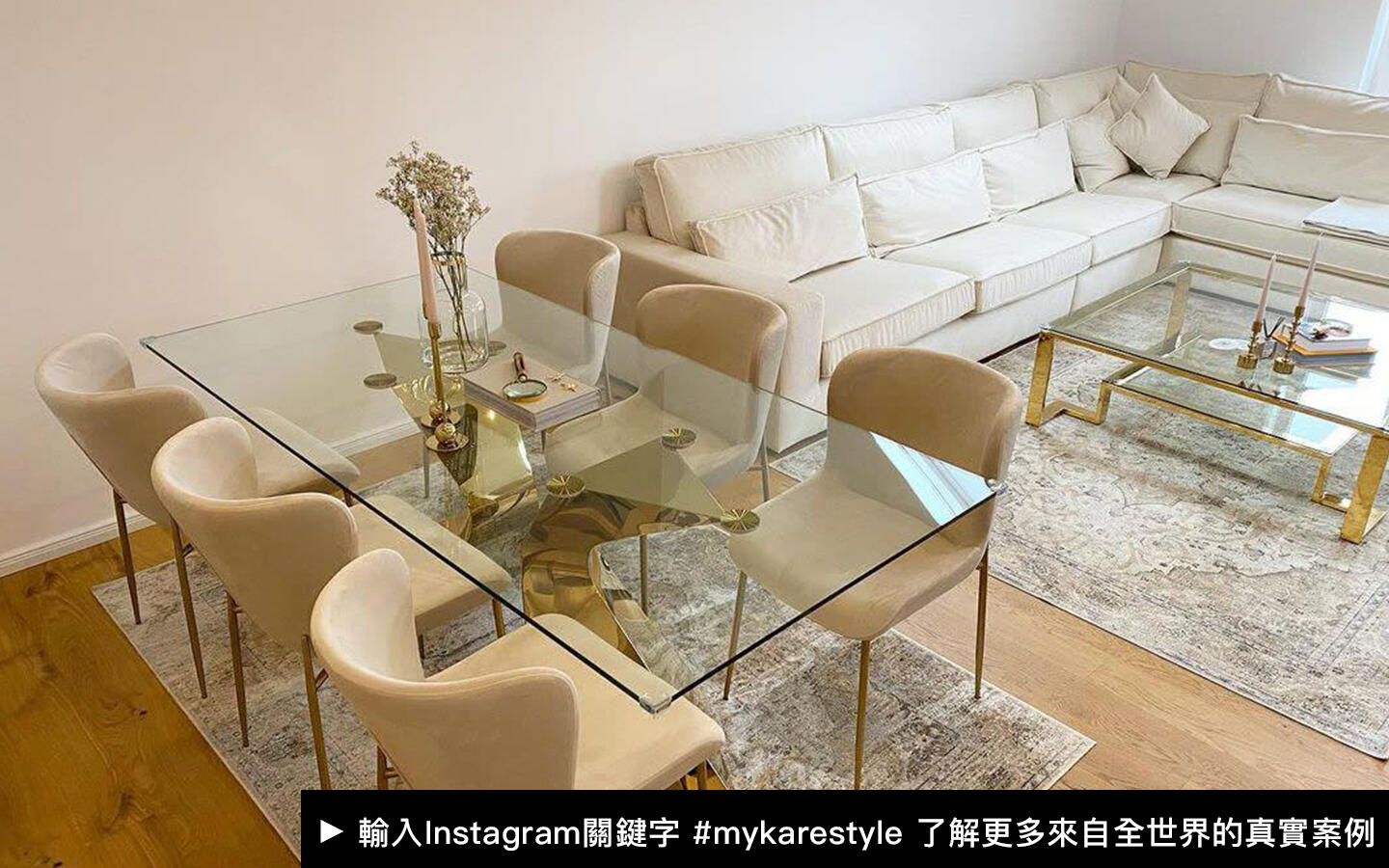 - 金色是近年的流行色,既奢華經典又溫暖柔和,無論搭配淺灰色時尚空間或白色、淡粉紅等女性化空間,這款餐桌都能華麗映襯,適合各種風格